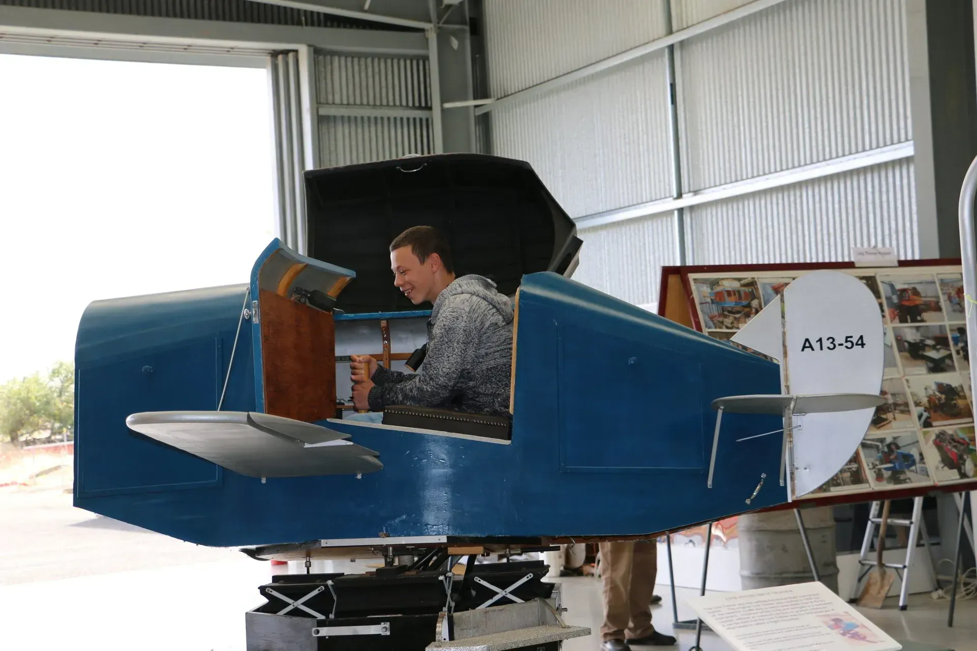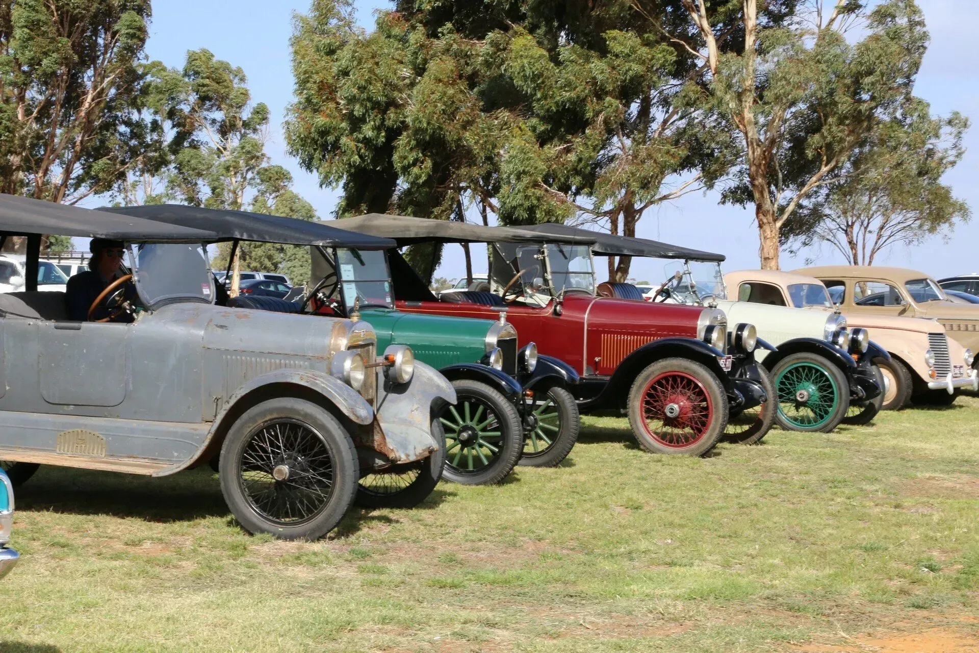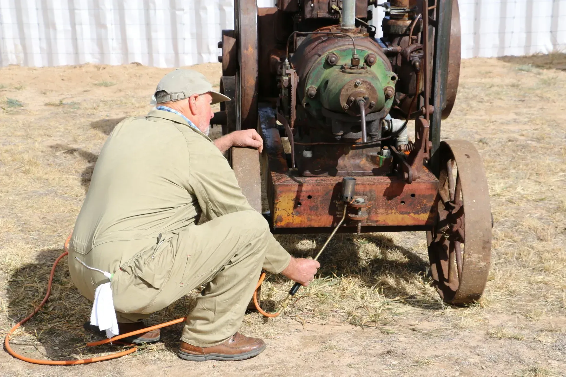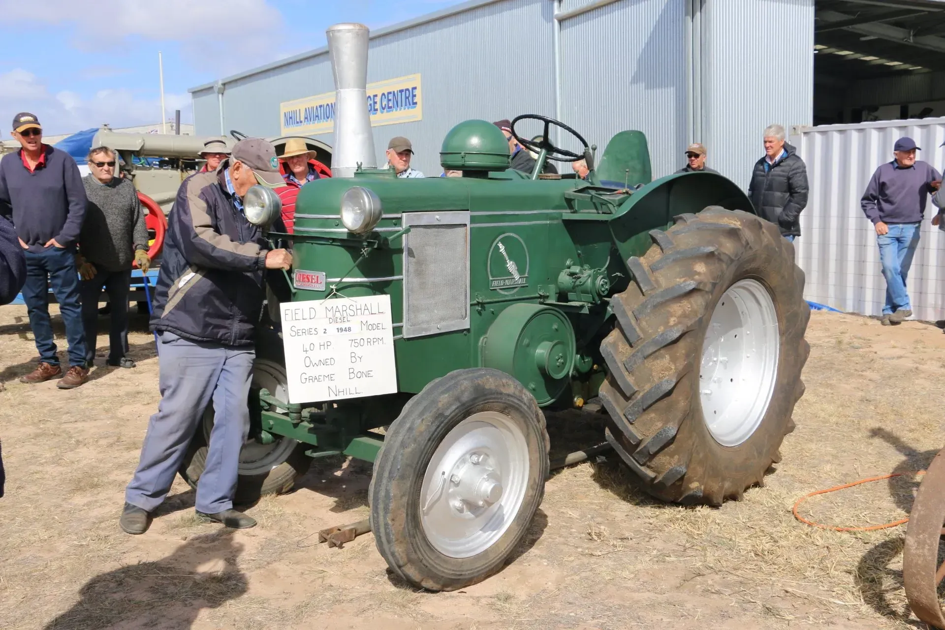 Due to the windy conditions the de Soutter, Nhill’s first locally owned aircraft, remained inside the Hangar, but a restored Gypsy motor similar to the engine in the de Soutter was started up in its place. Tractors from the Nhill Vintage Machinery Club were on show, to demonstrate a range of ‘start up’ procedures used by the early models. Onlookers waited in suspense as engines were primed by turning flywheels, crank handles, using blowtorches or cartridges, but in each case the motors started in a cloud of smoke. How fortunate we are to live in an era where a simple key will start an engine! Vintage model aeroplanes were started, along with a whole row of Harley David- sons. Daryl Meek brought a pristine 1936 Bugatti racing car to be started, while vintage Army trucks and classic cars were all on display. The CFA demonstrated their fire-fighting capabilities showing that we are in good hands if a fire starts in our district. The whole program was repeated in the afternoon allowing more people to enjoy the demonstrations.